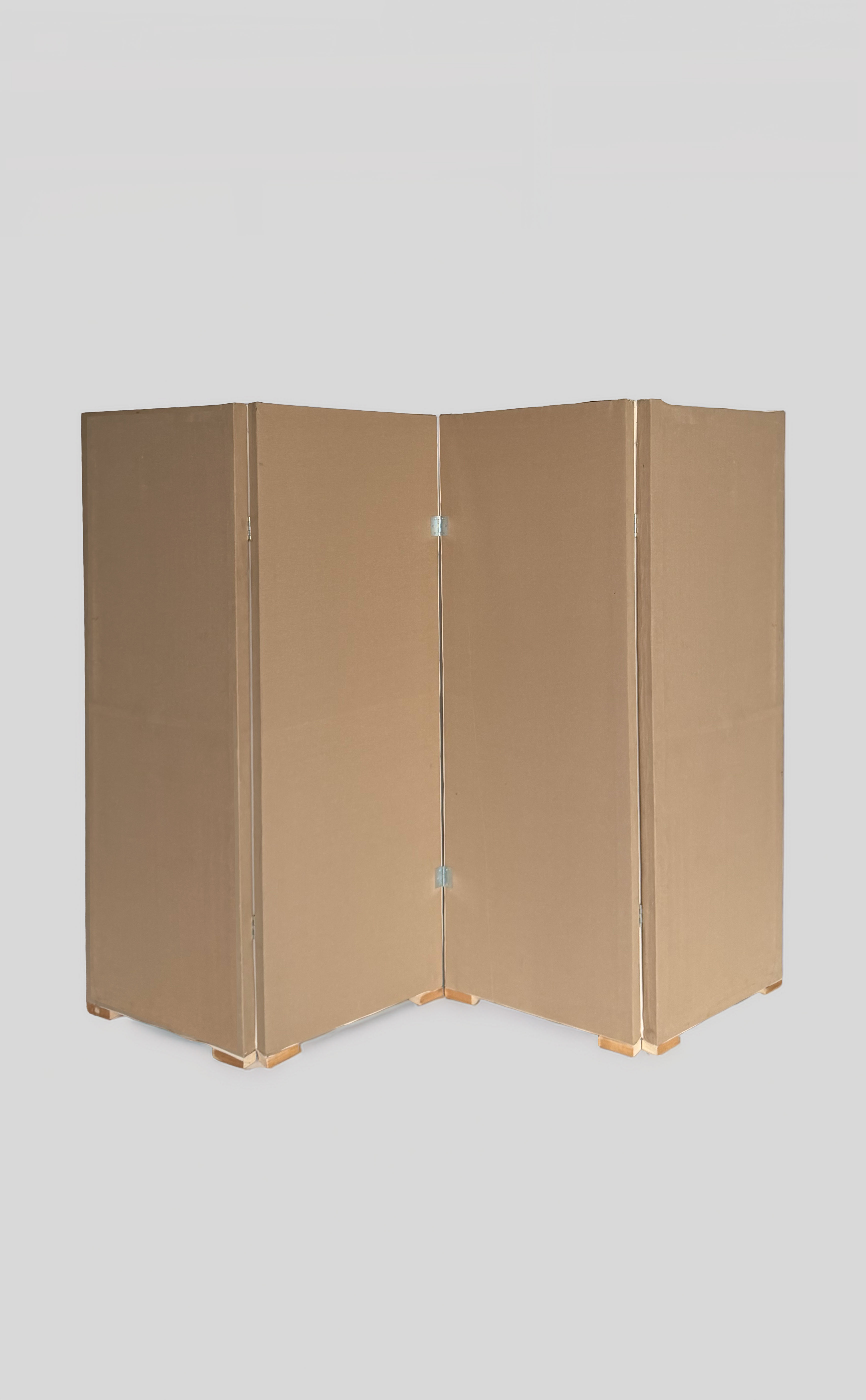 Wooden three-panle room divider with brown fabric sides